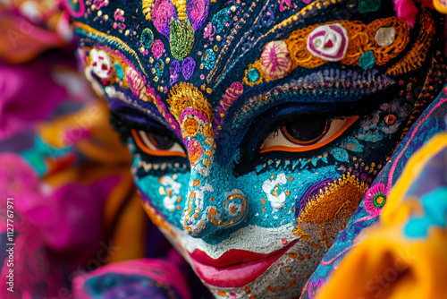 Fototapeta premium Close-up of a colorful Catrina mask, detailed face paint, traditional attire, vibrant colors, festive and cultural celebration focus