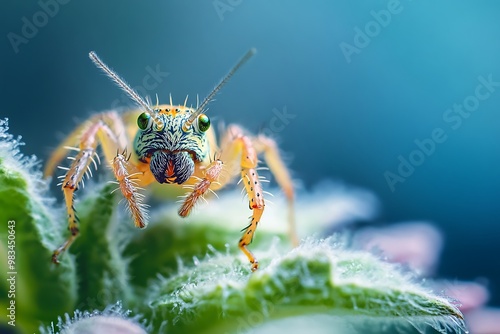 © atar, Naklejka premium Close up of a colorful jumping spider with big eyes on green leaf. Macro photography of insect wildlife.