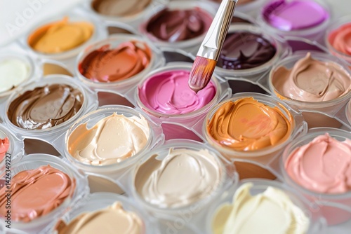 Naklejka premium Close-up of a colorful paint palette with a paintbrush