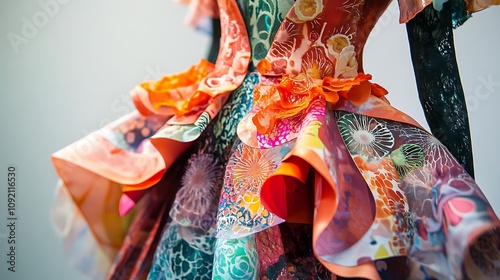 © wrap01, Fototapeta premium Close-up of a Colorful, Patterned Dress with Ruffles