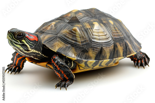 © imagemir, Obraz premium Close-up of a colorful Red-eared Slider turtle showcasing rich patterns and vibrant colors.