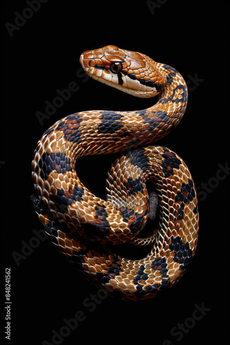 © Preeyada, Obraz premium Close-Up of a Colorful Snake on a Black Background with Detailed Scales and Patterns, Perfect for Nature, Wildlife, and Reptile Enthusiasts