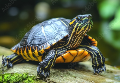 © ANUAR, Obraz premium Close-Up of a Colorful Turtle Resting on a Log Surrounded by Lush Greenery in a Serene Natural Habitat
