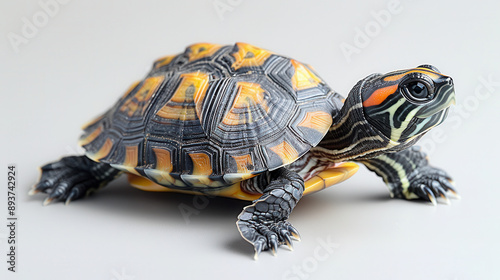 © dragonflypor9, Obraz premium Close-up of a colorful turtle showcasing its intricate shell pattern and vibrant markings on a neutral background