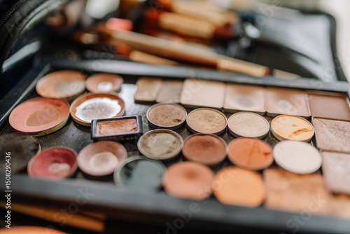 Naklejka premium Close-up of a colorful, well-used makeup palette with various shades of powders, blushes, and eyeshadows arranged in a case..