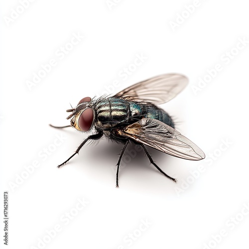 © Buse, Obraz premium Close-up of a Common Fly: A detailed view of a common fly, showcasing its intricate compound eyes, delicate wings, and segmented body.