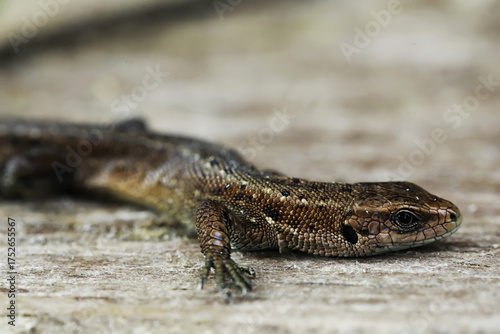 Naklejka premium Close-Up of a Common Lizard Resting on Wood: Nature, Reptiles, Wildlife Photography