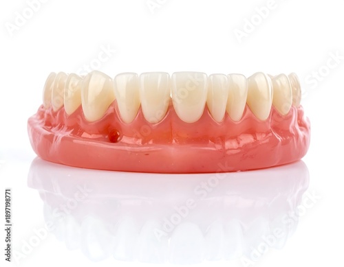 Obraz premium Close-up of a complete set of artificial dentures on white background