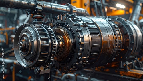 Fototapeta premium Close-up of a complex industrial engine component in a busy manufacturing...