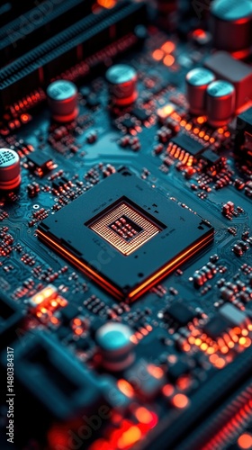 © Lemdah, Fototapeta premium Close-up of a computer circuit board with a central processing unit
