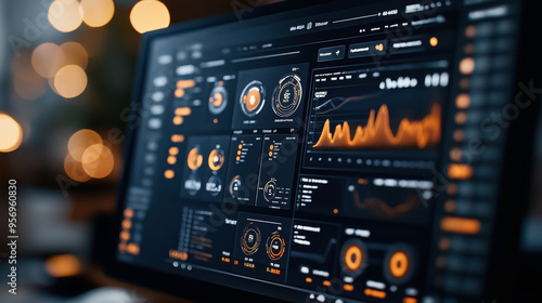 Obraz premium Close-up of a computer monitor displaying a complex data analytics dashboard with charts, graphs, and gauges highlighted in orange in a dimly lit environment.