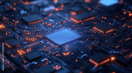 Fototapeta premium Close-up of a computer processor chip with glowing circuits. This image represents technology and innovation.