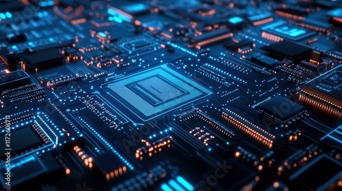 Fototapeta premium Close-up of a computer processor chip with glowing circuits. This image represents technology and innovation.