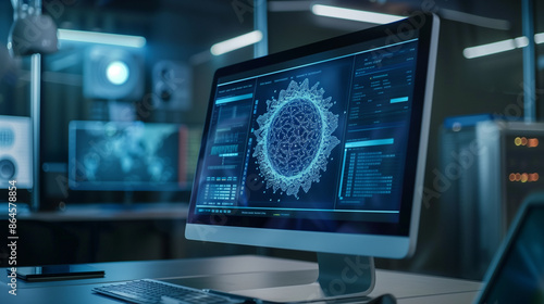 Fototapeta premium Close-up of a computer screen displaying an antivirus scan in progress
