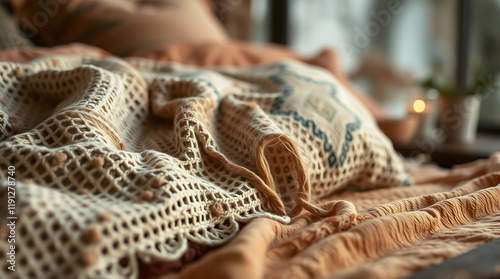 Fototapeta premium Close-up of a Cozy Knitted Blanket in a Warm and Relaxing Bedroom Setting. Perfect for Home Decor and Interior Design Inspiration.