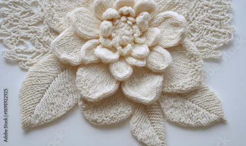 Fototapeta premium Close-up of a crocheted/knitted flower and leaves. Cream-colored, detailed,...