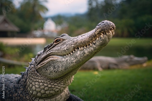 © TheWaterMeloonProjec, Naklejka premium Close-up of a crocodile's head in a natural setting