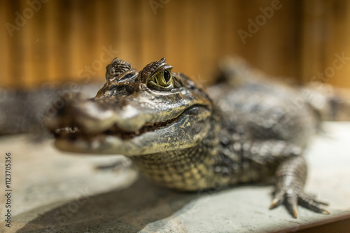 Naklejka premium Close-up of a crocodile's head, showing its sharp teeth and scaly skin..