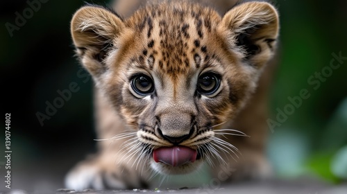 Fototapeta premium Close-up of a curious, adorable, young lion cub with large, expressive eyes, a slightly open mouth, and visible tongue. Its coat displays a rich, patterned mix of light and dark browns