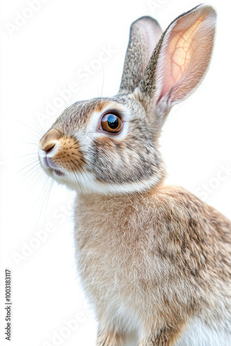 Fototapeta premium Close-up of a curious brown and white rabbit with upright ears against a plain white background.