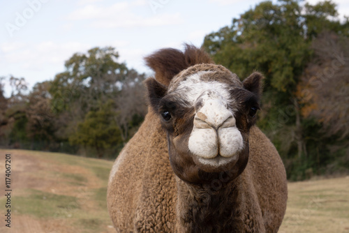 © Mandy, Obraz premium Close-Up of a Curious Camel in a Scenic Outdoor Setting