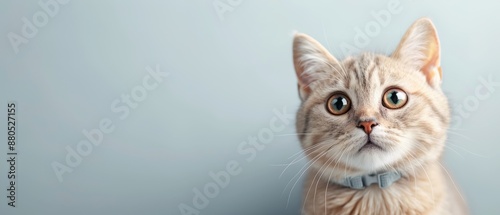 Obraz premium Close-up of a curious cat with a blue collar against a light background,...