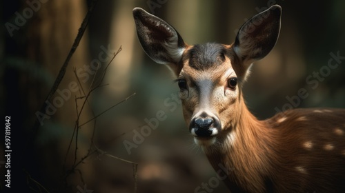 Fototapeta premium Close-up of a curious deer in the forest. Generative AI illustration.