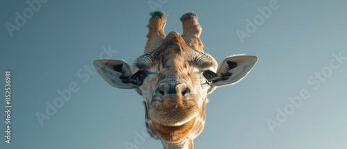 © narak0rn, Naklejka premium Close-up of a curious giraffe looking directly into the camera against a clear blue sky background, showcasing its unique facial features.