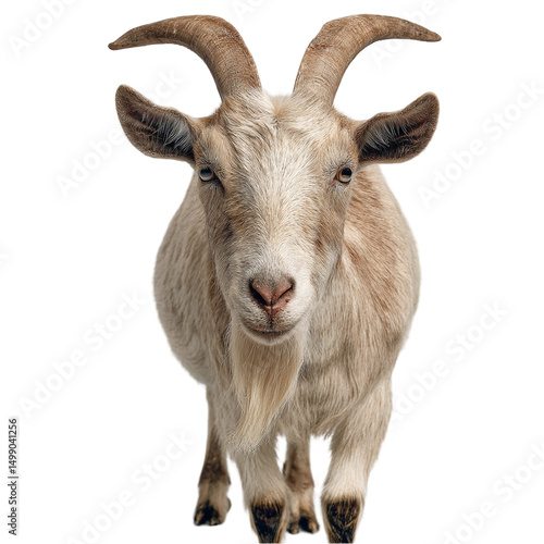 © Satya, Fototapeta premium Close-up of a curious goat with prominent horns, set against a plain background, showcasing its features