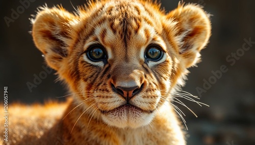 © Zahar Berduta, Obraz premium Close-Up of a Curious Lion Cub with Striking Eyes