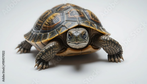 Obraz premium Close-up of a curious young tortoise against a white background.