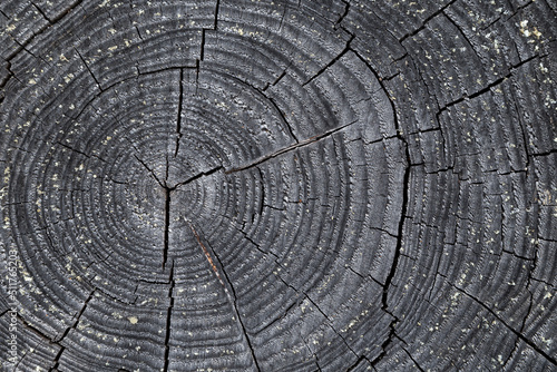 Naklejka premium Close-up of a cut, old and gray tree stump, viewed from directly above. Abstract natural textured background.
