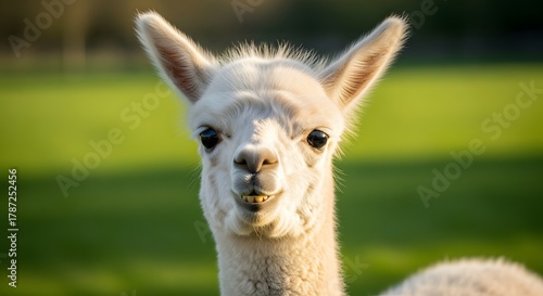 © Parjan, Naklejka premium Close-up of a cute alpaca with fluffy white fur and expressive eyes standing outdoors in a grassy field during daytime