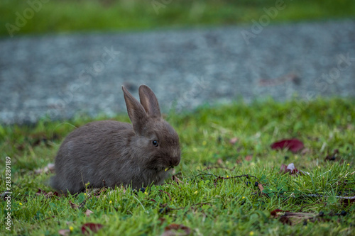 © Yi, Fototapeta premium close up of a cute brown bunny eating on green grass field under the shade