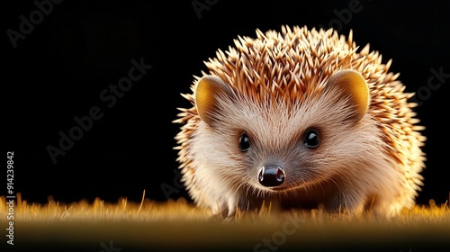 © Naphatson, Fototapeta premium Close-up of a cute hedgehog with brown and white fur, looking at the camera.