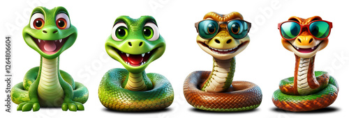 © Alberto Masnovo, Fototapeta premium Close-up of a cute smiling snake or reptile while looking at the camera with his big eyes or goggles. Isolated on transparent or white background. Png. Collection and variation. Generative Ai.