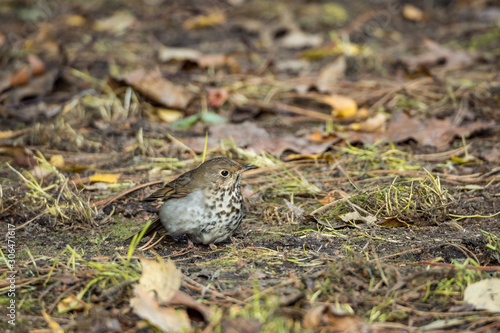 © Yi, Fototapeta premium close up of a cute tiny bird resting on fall leaves covered ground searching for food
