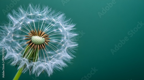© Alpha, Fototapeta premium Close-up of a dandelion at seed stage, with seeds delicately ready to disperse, against a lush green backdropCapture the intricate details of the seeds in the wind