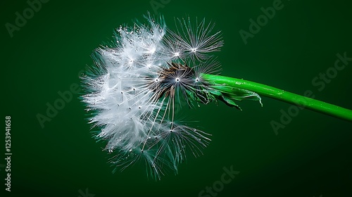 Fototapeta premium Close-up of a dandelion seed head against a dark green background, showcasing...
