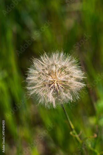© Vladislav, Fototapeta premium Close-Up of a Dandelion Seed Head Against a Green Background