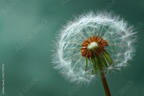 © Fire Light, Fototapeta premium Close-up of a dandelion seed head against a teal backdrop