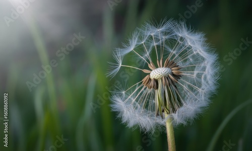 © irawan710, Fototapeta premium Close-up of a dandelion seed head, soft light, blurred green background