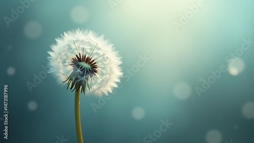 © Fukuro, Fototapeta premium Close up of a dandelion seed head with a green background perfect for spring or summer themed design