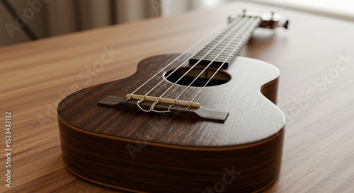 Fototapeta premium Close up of a dark brown ukulele with strings on a wooden surface in soft natural lighting
