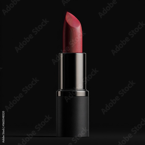 © Syawwal, Obraz premium Close-up of a dark burgundy lipstick against a black background. The lipstick's cap and body are matte black. A glossy, burgundy color is visible on the lipstick's tip
