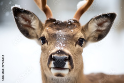 Naklejka premium close-up of a deers face with snowflakes on fur