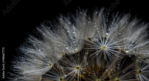 © Donnangelo, Naklejka premium Close-up of a delicate dandelion seed head with water droplets, set against a striking black background, showcasing nature's intricate beauty.