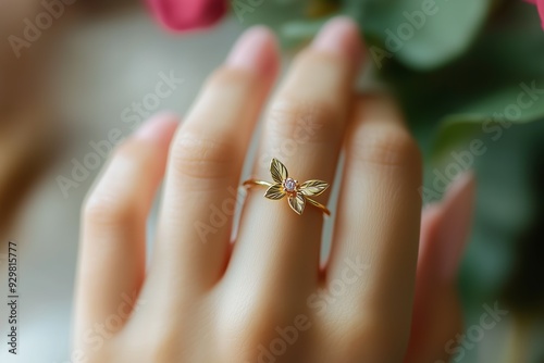 © Alex Photography, Fototapeta premium Close-up of a delicate gold ring with a leaf design and gemstone, worn on a hand with manicured nails.