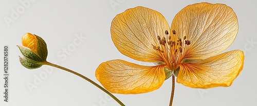 © Conan, Obraz premium Close-up of a delicate orange flower bud and bloom against a plain background