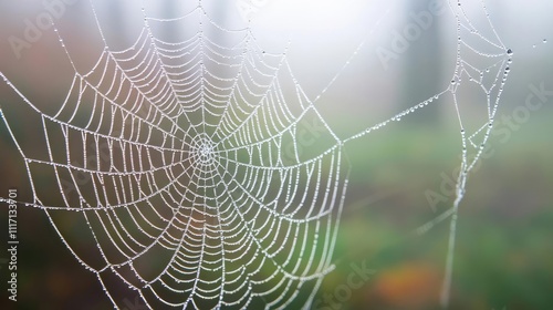© Jiraporn, Naklejka premium Close-up of a delicate spider web glistening with dew in a foggy forest.